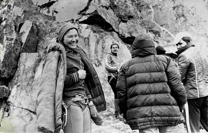 Динар Кинжебаева на восхождении с альпинистами секции Политехнического института. Под скалами Александр Тишаков. 1970-1980 годы. Из архива Динар Кинжебаевой. Динар Альжановна Кинжебаева. 1 разряд по альпинизму. Кандидат технических наук. Преподаватель Казахского Национального педагогического университета.